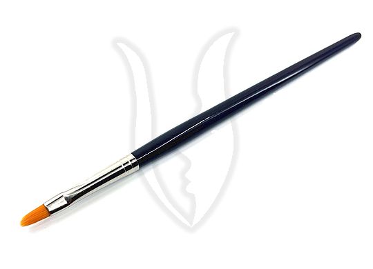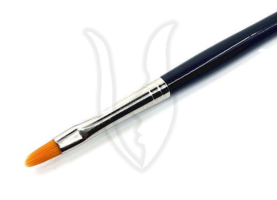 Enyhén félkör ívben, oválisan kialakított fejrésszel rendelkező, aranysárga szintetikus szálból készült ecset.