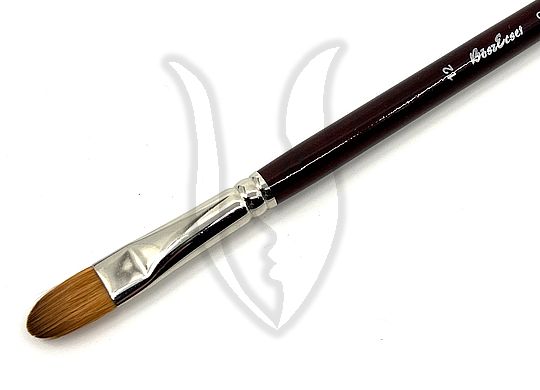 Kiváló minőségű szintetikus szálból készült olajfestő ecset, hosszú lakkozott mahagóni nyéllel.