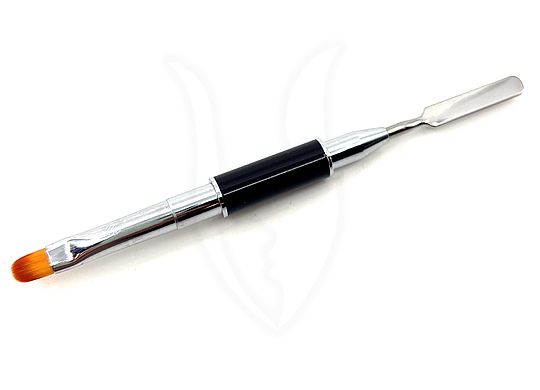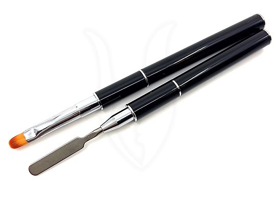 Tökéletes kombináció a rúzsecset használatához ez a dupla fejű kerekített rúzsecset fémspatulával. Mindkét oldala fémkupakkal zárható, praktikus kellék.