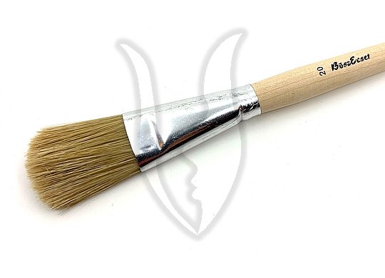 Hosszúkás ovális alakú, kissé erősebb szálú sörte ecset, rövid natúr fa nyéllel készül.