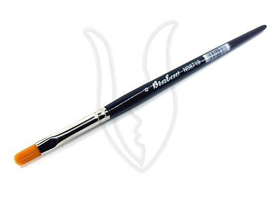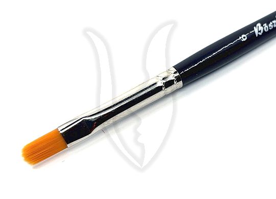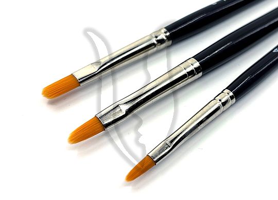 Enyhén félkör ívben, oválisan kialakított fejrésszel rendelkező, aranysárga szintetikus szálból készült ecset.